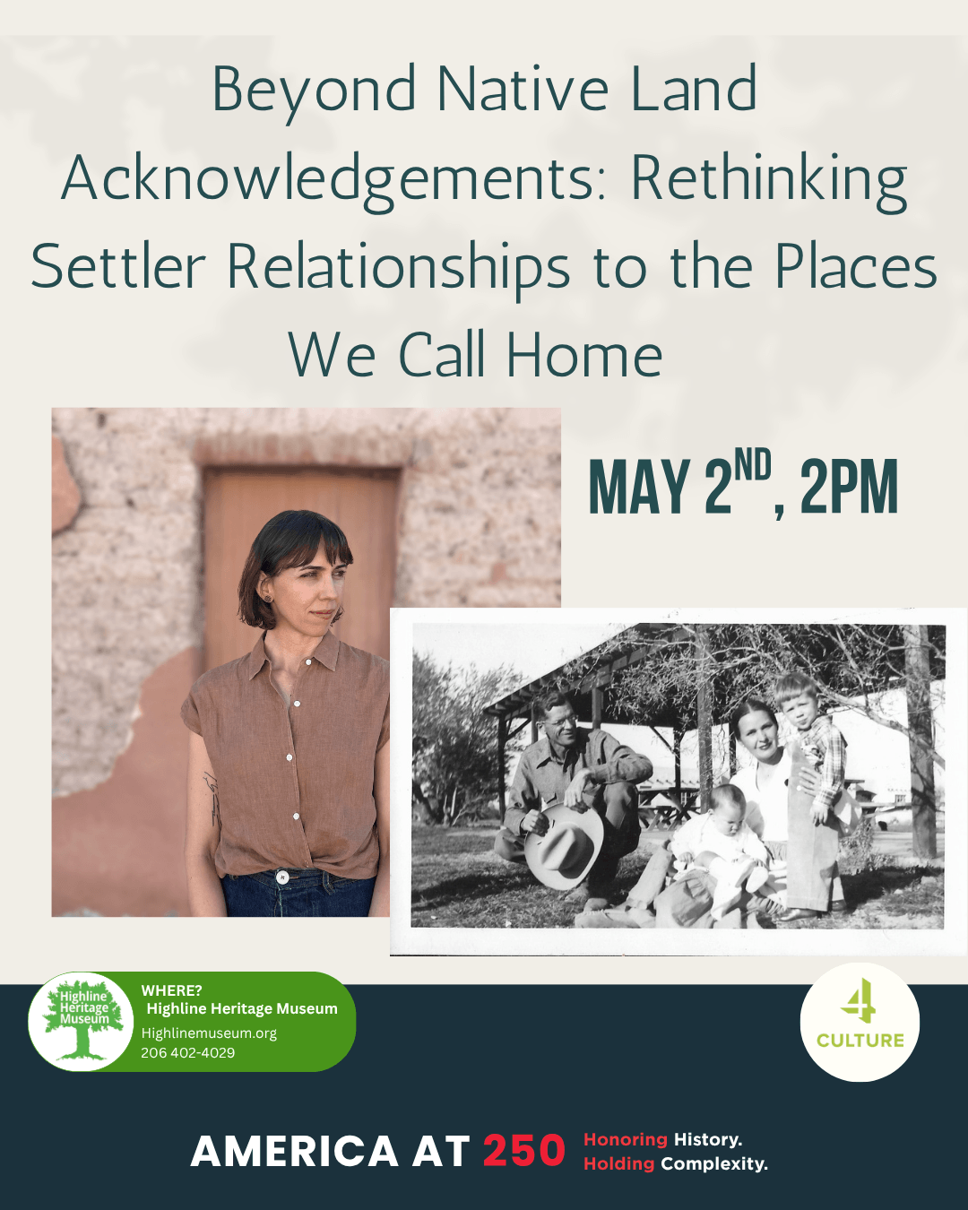 Highline Heritage Museum 819 SW 152nd St, Burien, WA, United StatesJoin historian Natasha Varner for a talk and workshop designed to explore the questions: How did we come to be settlers in the places we call home? How can we