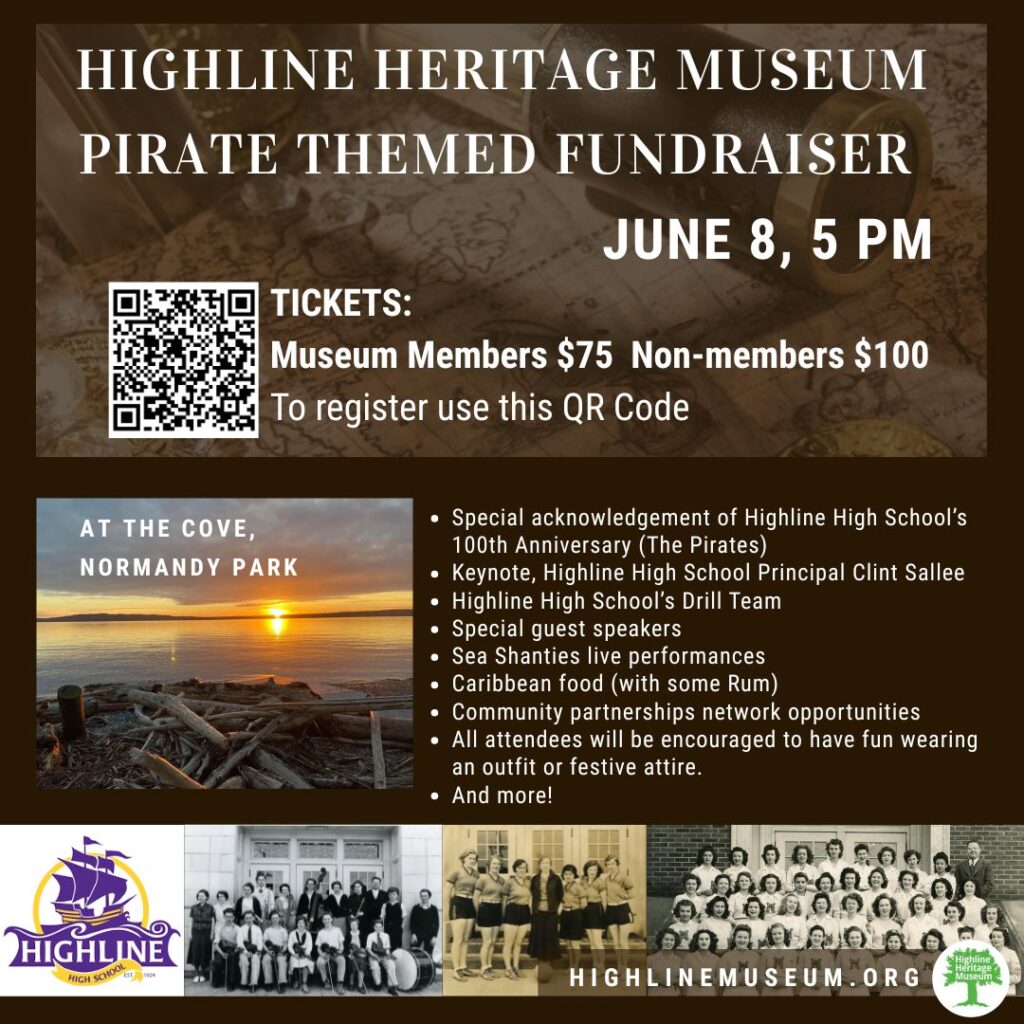The Highline Heritage Museum will celebrate its sixth anniversary on the evening of Sunday, June 8, 2025. This fundraising event will take place at the Cove at Normandy Park, feature special guest speakers, community partnerships, acknowledgement of Highline High School 100th Anniversary (The Pirates), reflections on the last 6 years, and previews of what’s ahead. In support of the event’s Pirate’s theme, all attendees will be encouraged to have fun wearing an outfit.